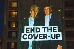 Photos of Jeffrey Epstein and US President Trump were projected onto the hotel hosting a gala for White House press.