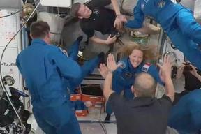 Astronauts hug and high-five as new crew arrive at International Space Station