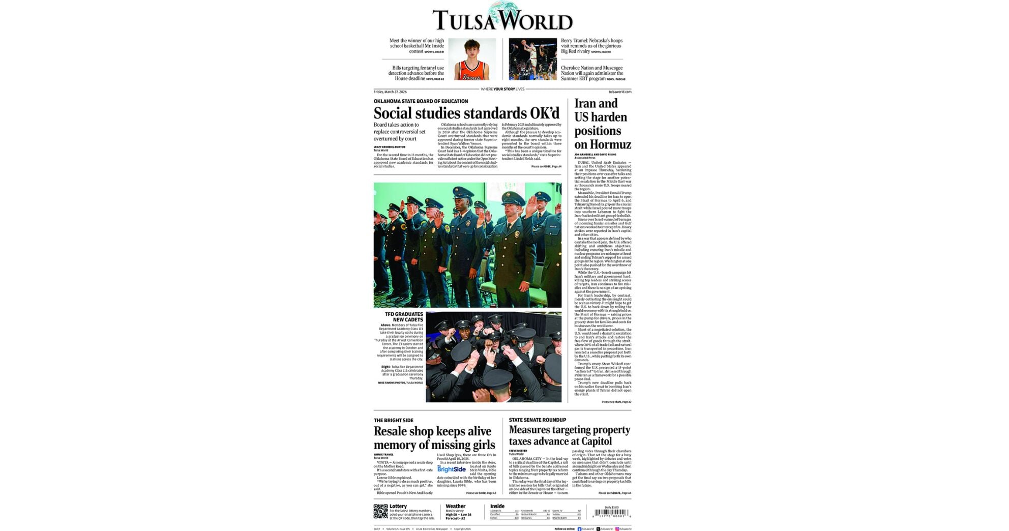 Stories from the front page of today's Tulsa World: March 27, 2026